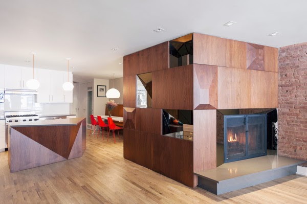 This loft is located in New York, its center does not get much light and is where the kitchen. Thus a series of mirrored surfaces was created to help reflect natural light into the room!